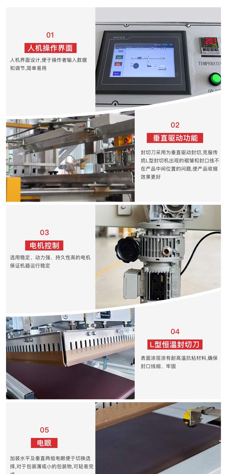 介紹:全自動L型垂直上下封切收縮機(jī)是在L型封切收縮包裝機(jī)的基礎(chǔ)上升級改造的一款設(shè)備,主要針對較高、較薄的產(chǎn)品封切收縮,可自動完成送料、套膜、封切、收縮等步驟,保證其封口線處于中間位置,每分鐘產(chǎn)量可達(dá)15-40件,適合POF膜和膠聯(lián)膜,自動吹膜,封口線細(xì),整齊。該款封切收縮包裝機(jī)在化妝品行業(yè)應(yīng)用廣泛,也適用于印刷、彩盒、日化、汽配、五金、食品等行業(yè)。
