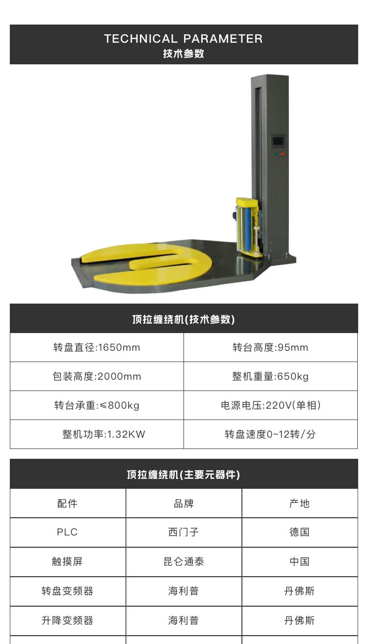 介紹:PLC可編程控制,纏繞程序可選。 人機界面式文本控制顯示系統,實時顯示設備運行狀況。 德國倍加福光電開關自動感測貨物高度。 纏繞層數、運行速度、薄膜張緊度任意可調,操作方便簡單。 獨立變頻控制預拉伸自動送膜系統,拉力自由調整。 頂部及底部纏繞圈數分別單獨控制,1-9圈自由調節。 自動、手動可切換,幾乎無需日常維護。