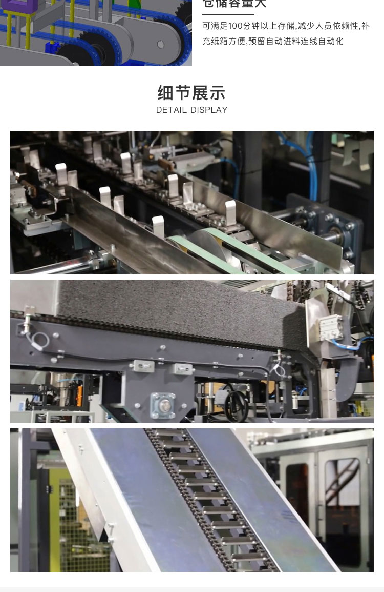 介紹:HW-HT-XH01A采用多吸盤連續式吸盤吸盒,整機由PLC人機界面控制,采用了鏈排式連續運動原理,從而保證了高速運行的穩定性。依據客戶對產品所需做聯機儲備接口。物料通過輸送電機驅動階梯式機械吸盤動作經轉輪至裝盒機輸送系統上,并在這個過程中完成進料系統。同時具備檢測功能,并設有自動調節功能使之運行速度能與前段計數包裝機的生產產能貼切匹配。該設備可與連續爐設備,膜包機,裝箱機等前后道設備相連接形成一條龍包裝系統,滿足企業生產,降低勞動力,節省包材等效果。